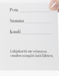 - Lahjakorttia käyttäessäsi, ilmoitathan kortissa olevan koodin.